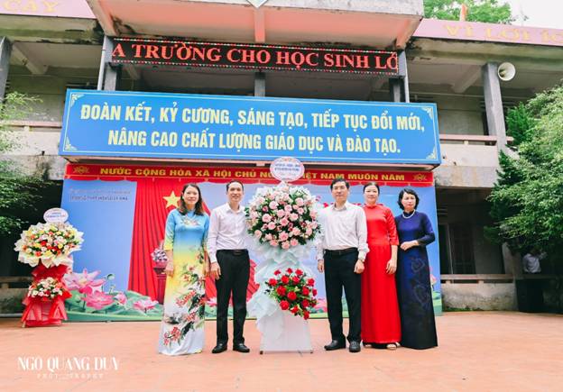 Đồng chí Hoàng Văn Long tặng hoa cho BGH nhà trường.